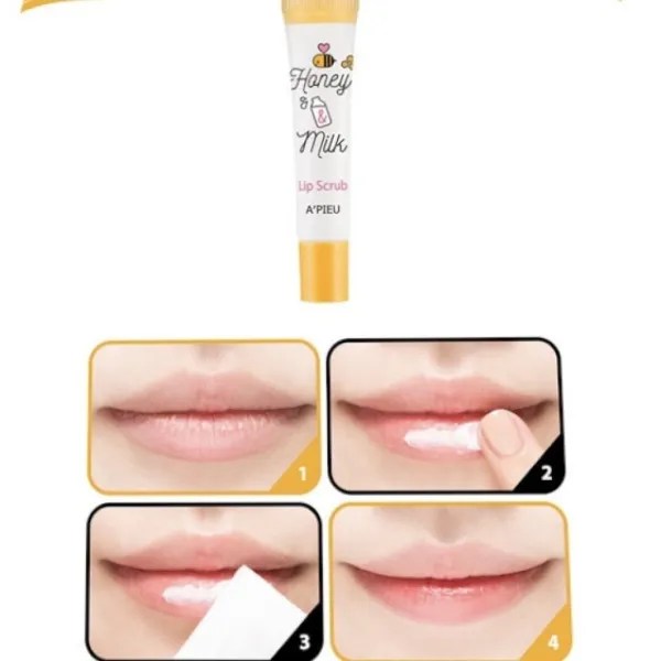 The A’pieu honey & milk lip scrub gently exfoliates and removes dead and flaking skin on the lips.